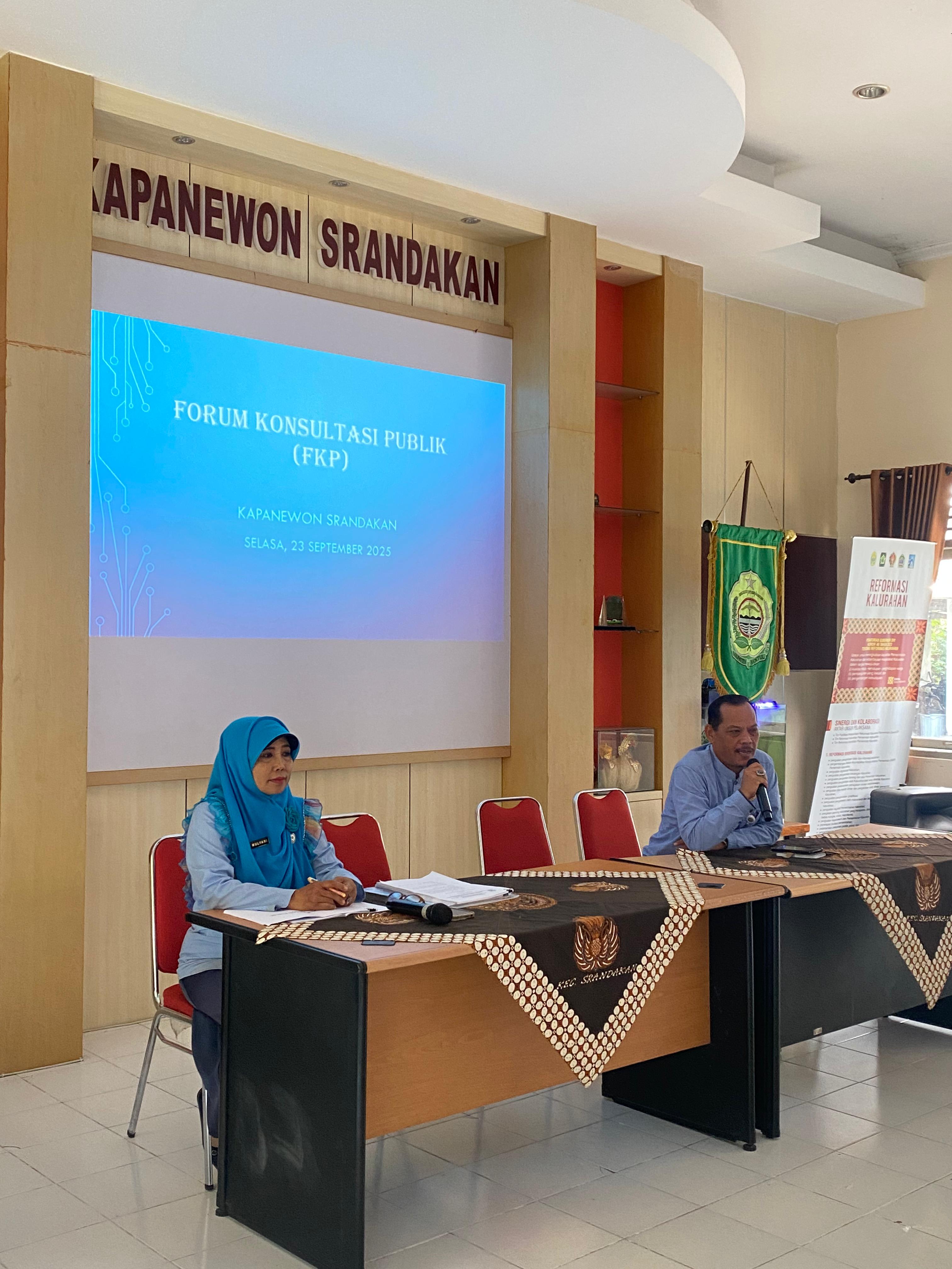 Srandakan menggelar Forum Kosultasi Publik (FKP) di Aula Kapanewon Srandakan, Selasa (23/9/2025). Peserta yang diundang adalah Forkompinkap, Lintas Sektor, Dinas Kependudukan dan Pencatatan Sipil, Bagian Organisasi, Media Massa dari Bernas Jogja, Lurah, Kamituwo, Ketua Bamuskal, Karang Taruna, Pendamping Desa, Bumkal, Koordinator PLKB, PKH, PPL dan perwakilan masyarakat pengguna layanan.