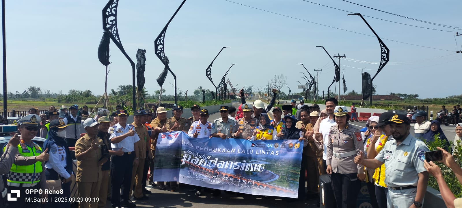 Setelah lama dinanti, Jembatan Pandansimo yang menghubungkan Kabupaten Bantul dengan Kabupaten Kulon Progo akhirnya dibuka untuk uji coba lalu lintas, Senin (29/9/2025). Pembukaan ini merupakan bagian dari program Uji Coba Lalu Lintas Terbuka (Trial Open Traffic) yang dimulai dari sisi Kulon Progo, tepatnya di wilayah Kapanewon Galur. Proses pembukaan dimulai dengan pemindahan barrier penghalang sekitar pukul 09.15 WIB. Panewu Srandakan Sarjiman, S.IP, ME, bersama jajaran Forkompinkap ikut hadir menyaksikan. Warga masyarakat sangat antusias sejak pagi menunggu jembatan dibuka.